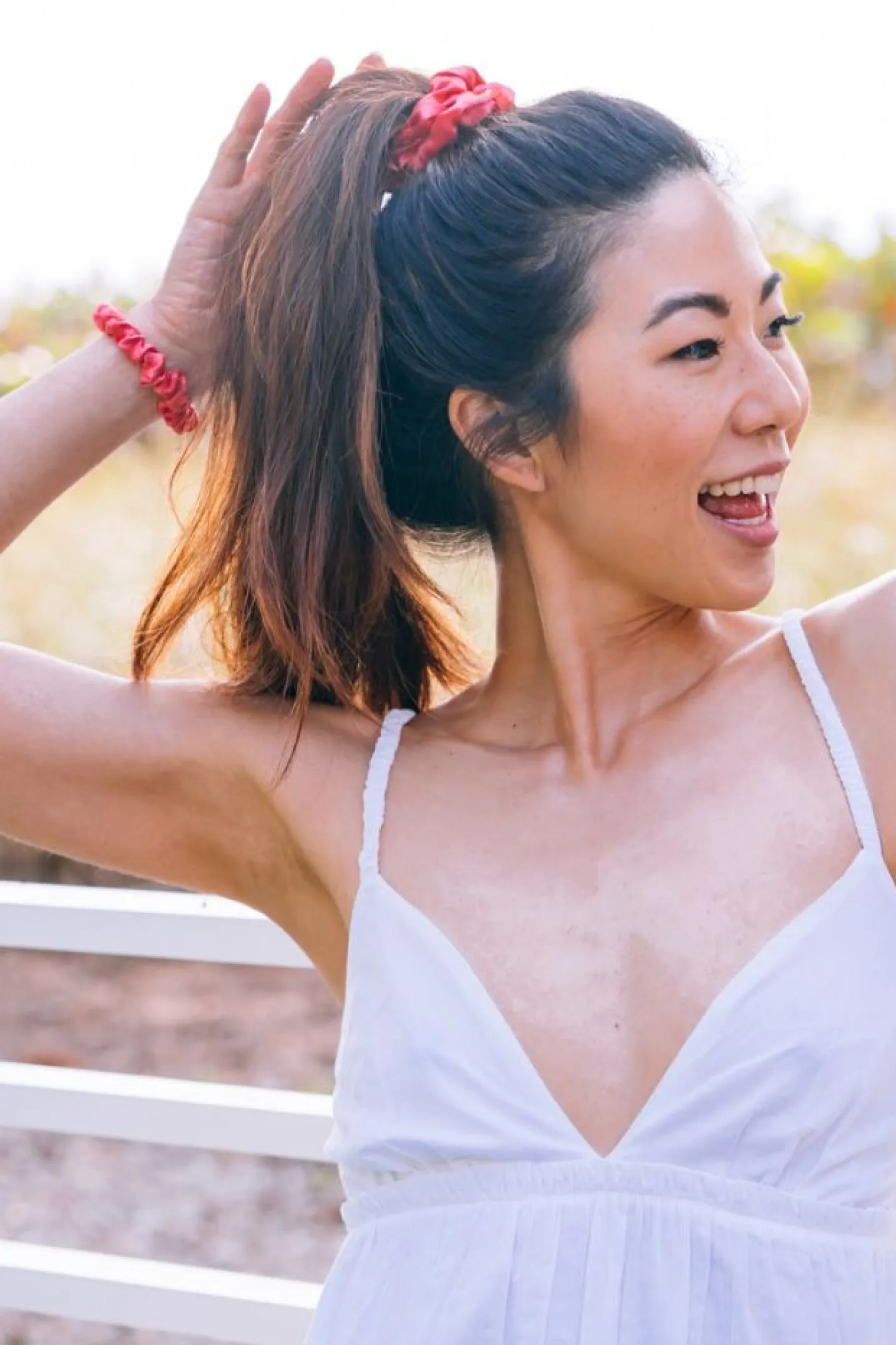 Take care of your bedtime hair and hold your hair in place with ease and softness! Slice of Summer Large Silk Scrunchies in Red offer a secure grip without slipping—thanks to the innovative inner coil—wrapped in soft, natural silk.