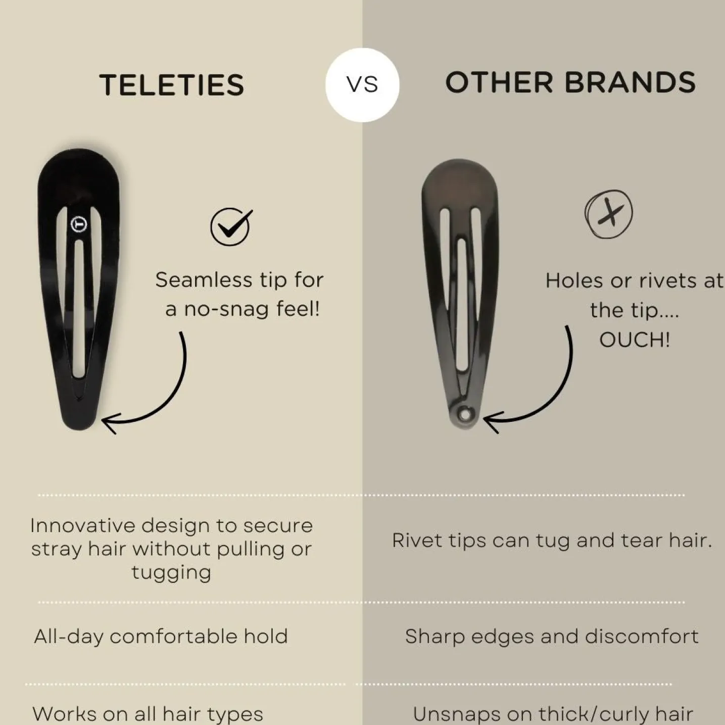 TELETIES Brown Snap Clips (6Ct) in Brown offer a secure seamless tip for a no snag feel. Perfect for all hair types, these stylish barrettes provide a gentle yet firm hold, whether you’re styling or simply pulling back strands. Available in a range of colors, TELETIES Snap Clips combine functionality with flair, ensuring your hair stays put all day long.