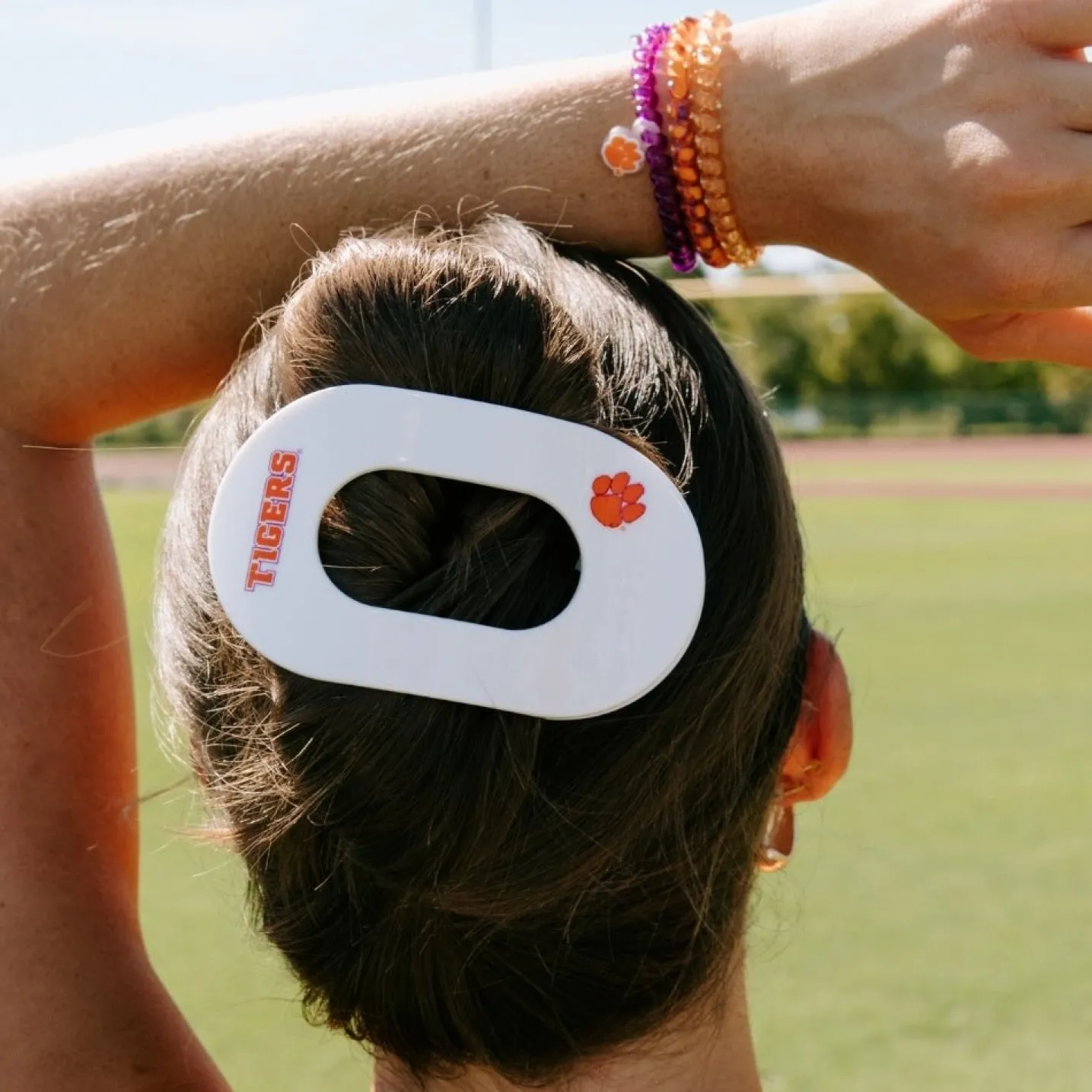 Lay flat and relax with the new TELETIES Go Tigers! Large Flat Round Hair Clip in White, Orange, and Purple. This hair clip is designed to allow you to lay back flat, do yoga, or sit comfortably in a seat with a headrest, and it is made with the same material that is nearly unbreakable. Shop your favorite Clemson University hair accessories now! Go Tigers!